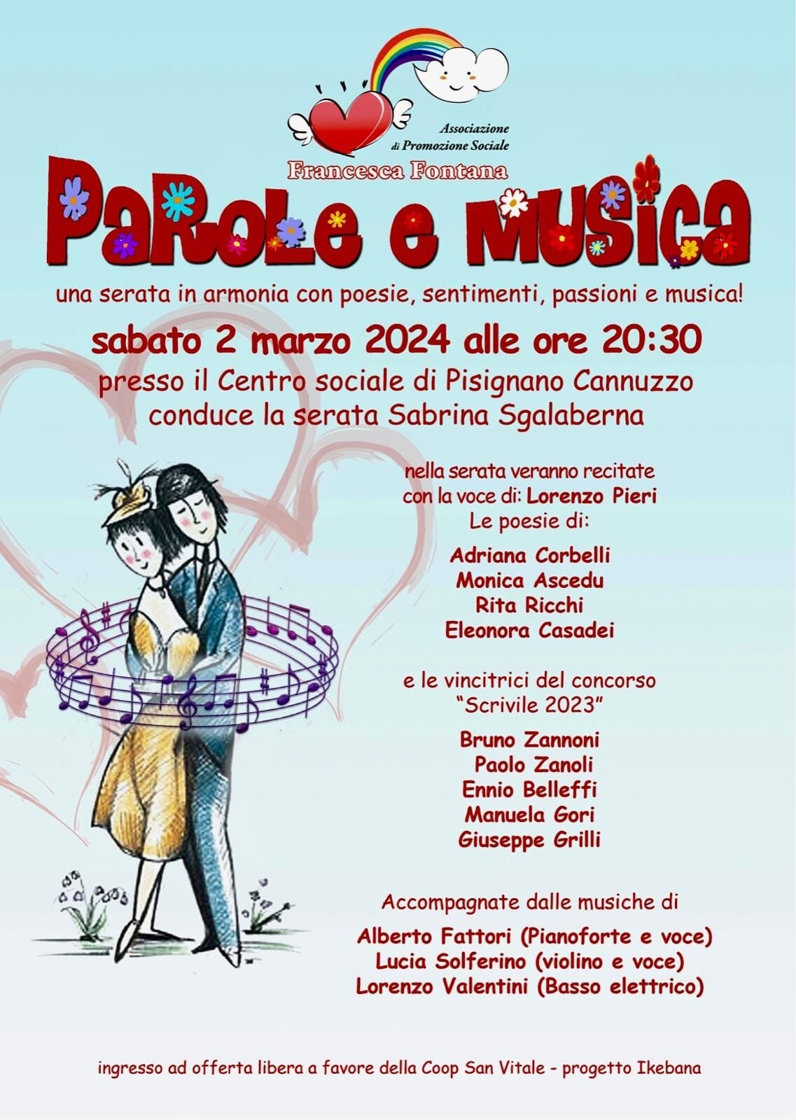 "PAROLE E MUSICA", la voce ai sentimenti con sorsi di musica che ubriacano il cuore. Un'atmosfera dove si respirano emozioni che profumano di vita.Ringrazio per questa meravigliosa esperienza i carissimi amici: Gianni Grandu (Consigliere provinciale Provincia di Ravenna ) e il giornalista Giuseppe Grilli , l'amica di sempre, la giornalista Sabrina Sgalaberna e l'Associazione Francesca Fontana per tutte le iniziative e progetti volti alla solidarietà in memoria di Francesca Fontana.